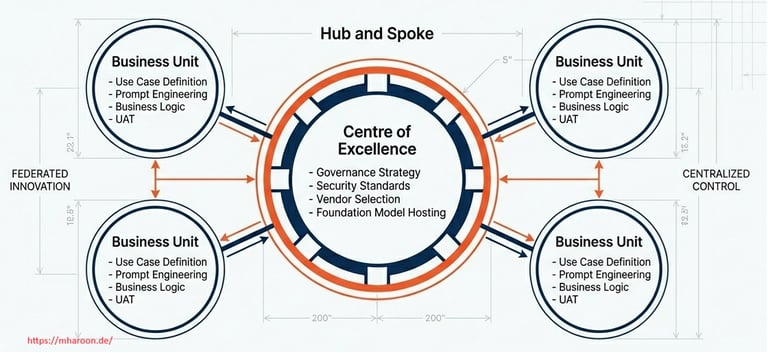 To manage AI development across an enterprise without stifling local innovation, a possible path for organizations is to adopt a hub-and-spoke model. In this structure, a central hub (often an AI CoE or “AI Office”) defines governance and provides shared resources, while distributed spokes embedded in business units drive implementation on the ground. This federated approach prevents the central team from becoming a bottleneck or losing touch with frontline needs. Each spoke (business unit pod) can experiment and deliver AI solutions rapidly, informed by deep domain knowledge, while the hub ensures they all adhere to common standards, ethics, and security practices. In effect, the governance is “loose-tight” – loose in allowing flexibility for local implementation, but tight in enforcing core principles and policies enterprise-wide.